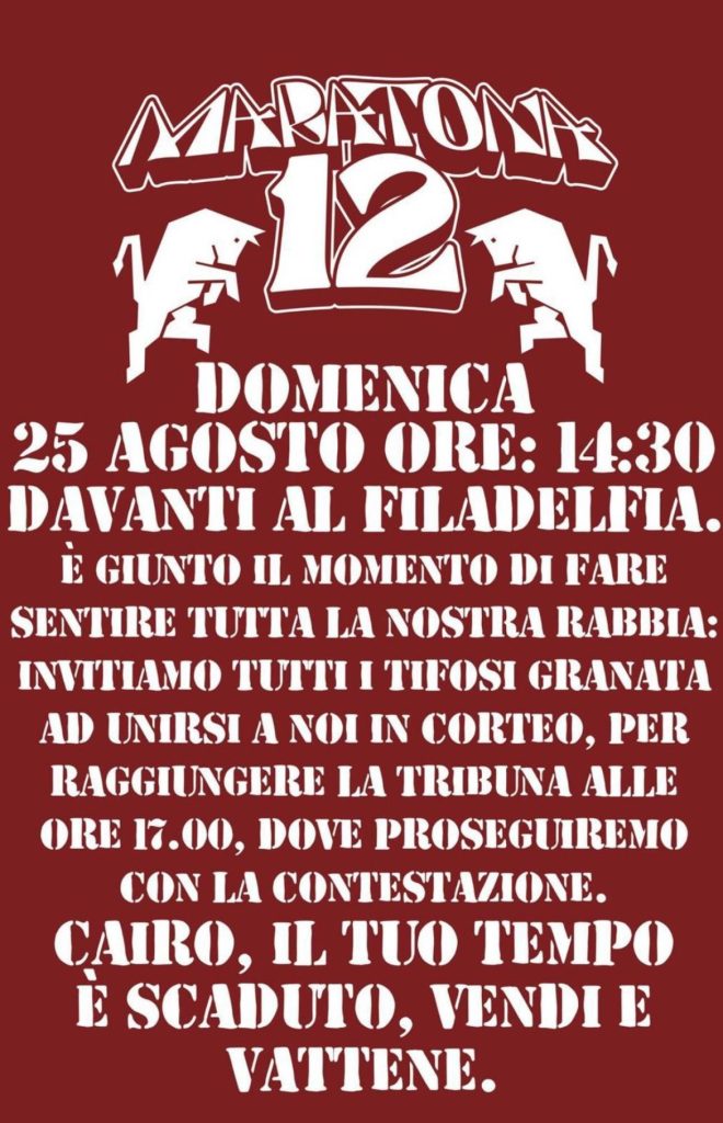 Niente diserzione: i tifosi del Torino non abbandoneranno il loro posto allo stadio domenica contro l’Atalanta. E’ il risultato del confronto andato in onda questa sera tra i rappresentanti del tifo granata. Tutti dentro quindi, ma a contestare il patron Cairo. La giornata comincerà alle 14.30 al Filadelfia dove il popolo del Torino si è dato appuntamento per raggiungere poi in corteo lo stadio. Alle 17 la contestazione proseguirà davanti alla tribuna. Poi proseguirà all’interno del Grande Torino, in un clima che si annuncia bollente.
