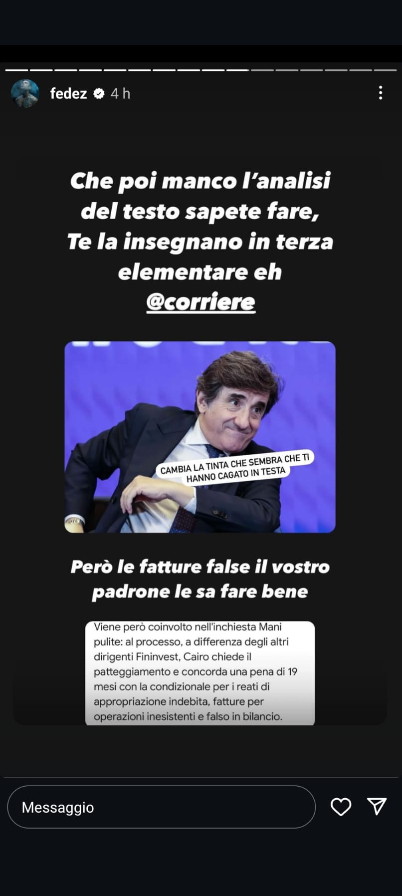 Anche Fedez attacca Cairo: “Sembra che ti hanno cag… in testa”. LA FOTO