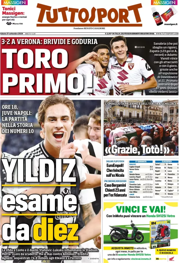 Juve-Napoli è la sfida che oggi può togliere il primato ai granata...
