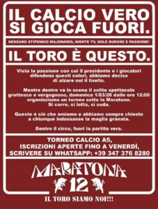 L’ultima trovata è un torneo che si disputerà domenica prossima a partire dalle ore 12 davanti alla curva Maratona, lanciato da un comunicato eloquente: “Il calcio vero si gioca fuori, nessuno stipendio milionario, niente tv, solo sudore e passione: il Toro è questo. Vista la passione con cui il presidente e i giocatori difendono questi colori, abbiamo deciso di alzare noi il livello”.
