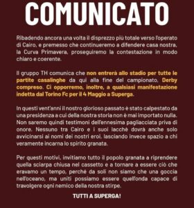 Niente tifo neanche contro il Parma. Continua la linea dura dei tifosi del Torino che proseguono lo sciopero del tifo – e delle presenze – inaugurato piedi un mese fa dopo il 6-0 subito a Como. Finora ĆØ andato in scena contro Lecce, Bologna e Lazio e, probabilmente, proseguirĆ fino al termine della stagione. Ma, se i gruppi della Maratona, hanno puntato l’ultima giornata, il derby, per tornare allo stadio, i Torino Holigans della Primavera hanno annunciato una linea ancora più estremista: fuori anche contro la Juve.Ā