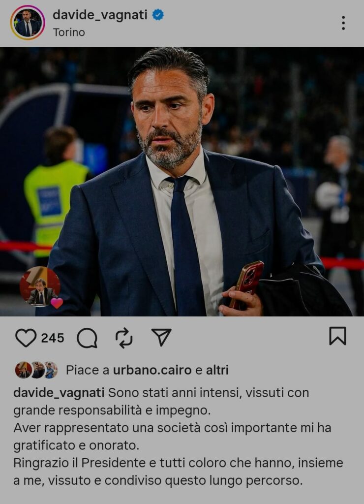 Il saluto su Instagram dell'ex direttore sportivo granata Davide Vagnati...